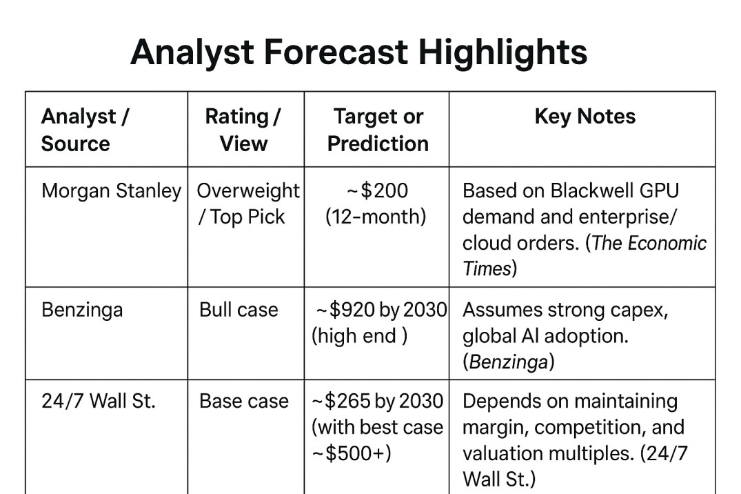 Morgan Stanley recently raised its 12-month price target for Nvidia to ~$200 (from ~$170), reaffirming its “top pick” status among semiconductor stocks. The firm cited exceptional demand for Blackwell chips and strong enterprise/cloud backlog.
